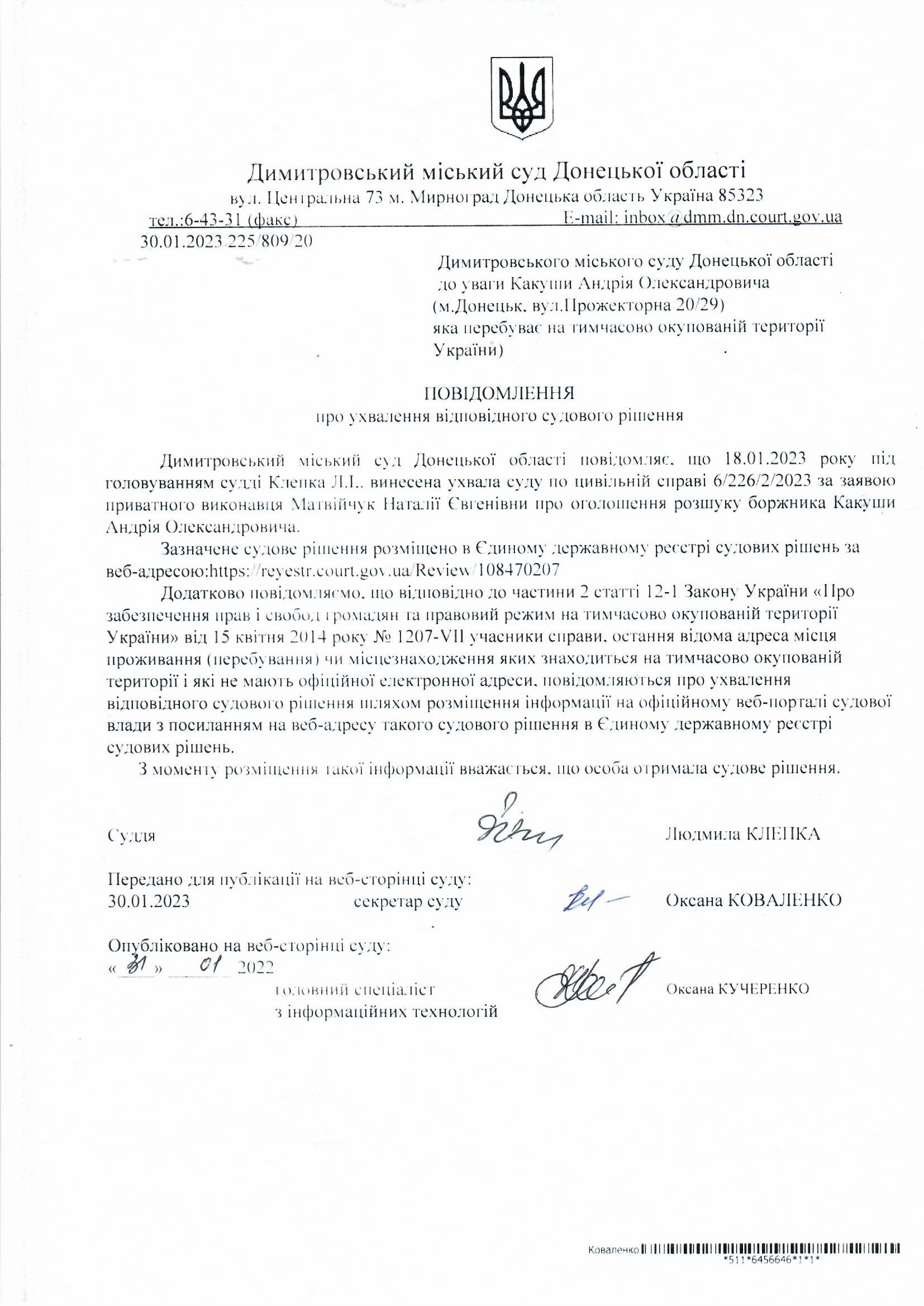 До уваги Какуши А.О. про винесення ухвали від. 18.01.2023