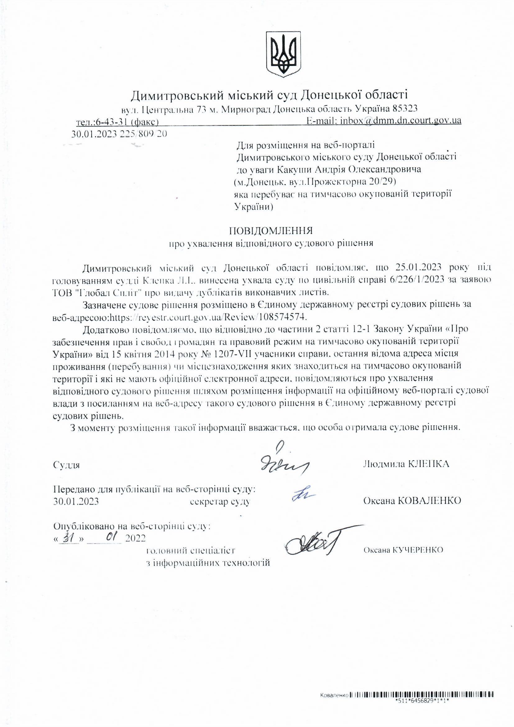 До уваги Какуши А.О. про винесення ухвали від. 25.01.2023