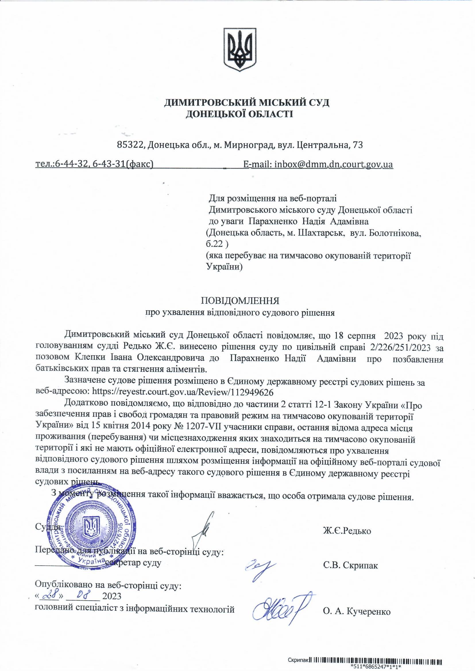 Повідомлення про винесення рішення суду у цивільній справі №2/226/251/2023 за позовом Клепки І.О. до Парахненко Н.А.